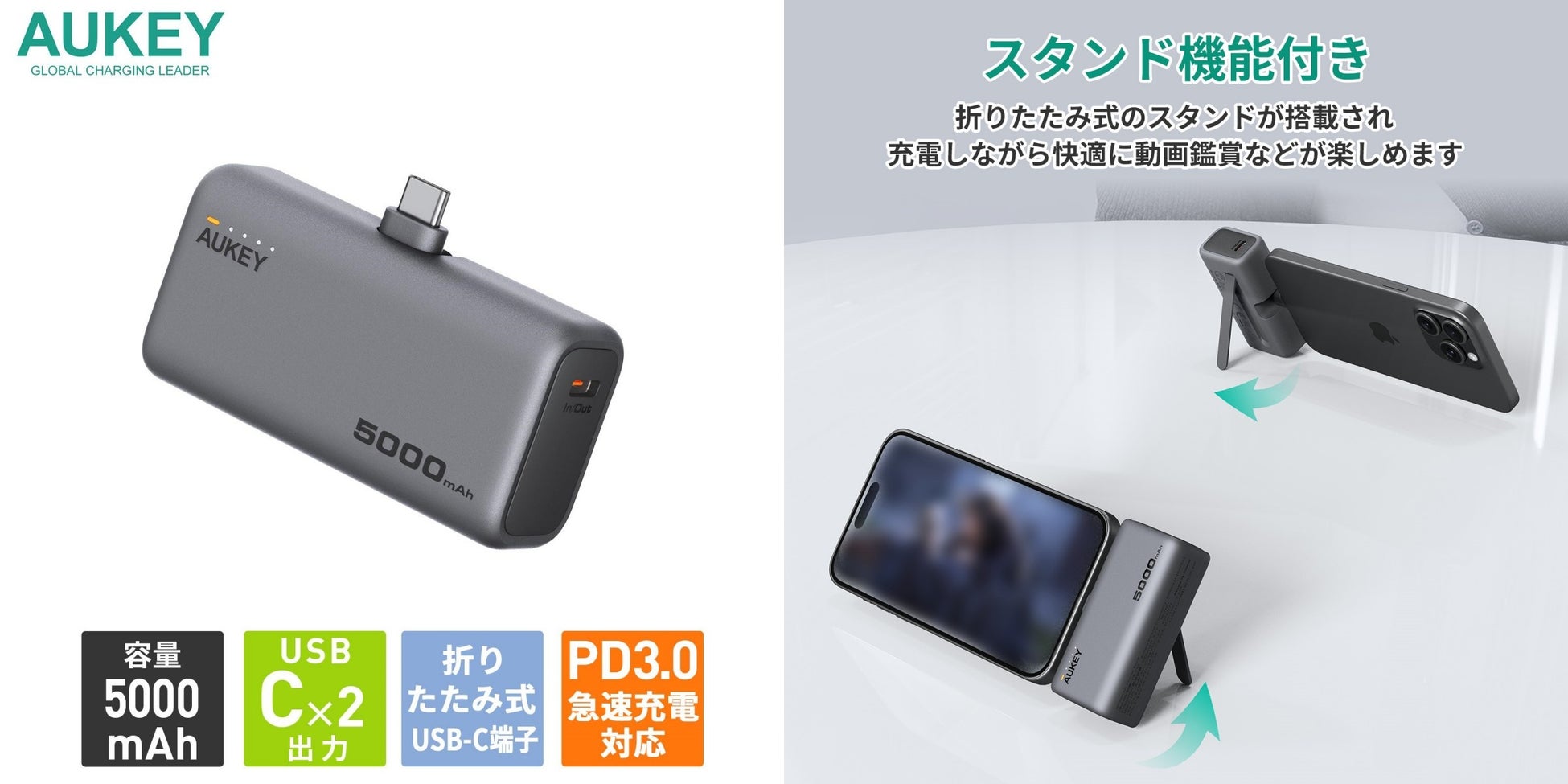 【AUKEY】 USB-C端子一体型 超コンパクトな5000mAh直挿しモバイルバッテリー 急速充電PD対応 「Spark Mini 5000」12月20日(金)に販売開始!
