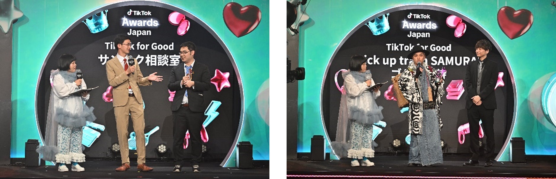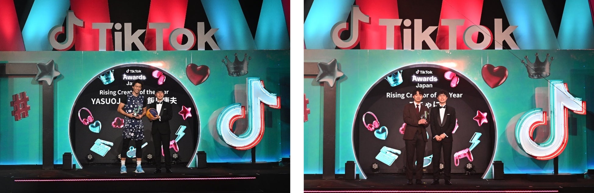 さらに、2024年に急速に注目を集めたクリエイターに送られる「Rising Creator of the Year」では、「YASUOJAPAN / 飯島康夫」(@yasuojapan)と「こちゃに」(@kochani1224)の2組が受賞。「YASUOJAPAN / 飯島康夫」は、3×3バスケットボールプレイヤーとして2022年度日本代表を務めるだけでなく、TikTokフォロワーが130万人を超えるクリエイターとしても目覚ましい成長を遂げました。TikTokでバスケをわかりやすく学べる方法などを発信し、競技者としての実績を土台に、バスケットボール業界全体の発展にも貢献しました。「こちゃに」は、ゲーム配信と実写コンテンツで活動するクリエイターです。今年1月からゲーム配信に注力し、7月には、TikTok公式Gaming LIVE Proに認定され、翌8月には世界最大規模のゲーム世界大会「Esports World Cup」にクリエイター枠で招待を受け、開催地であるサウジアラビアで大会出場選手へのインタビュー実施。その様子をTikTokコンテンツとして投稿するなど、1年で飛躍的な成長を遂げ、プラットフォームや業界に新たな影響を与えました。