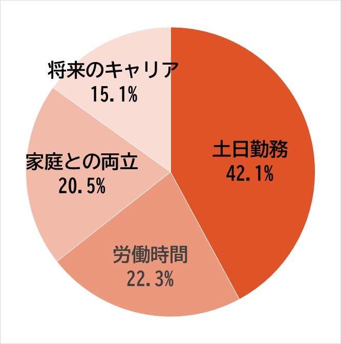 社会的課題や、「育児や介護と仕事を両立させるための多様な働き方が求められるなど、労働環境の大きな変化に直面しています。同社においては、ライフイベントを機に退職する女性社員が多く、例年全退職者の7割前後を占めていました。2022年12月、男女199名の社員を対象に行った同社の社内調査では、「当社で働き続けることについて不安はありますか」という問いに対し、4割近くが「不安がある」と回答しています。その理由として高かったのは、不動産業界特有の「土日勤務」や「労働時間の長さ」、「家庭との両立」不安で、全体の8割以上を占める結果となりました。