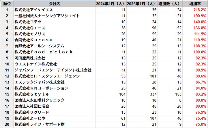 ・2024年1月時点と2025年1月時点の従業員数を比較