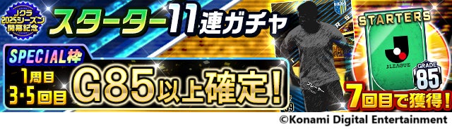 本キャンペーンでは、J1、J2全40クラブから各ポジション毎の4選手ずつ、総勢160名が「スターター」カードとして登場します。さらに期間中ログインするだけで「G85以上ガチャ券」などが手に入る「Jクラ2025シーズン開幕記念!スペシャルログインボーナス」や7回目に「お気に入りクラブG85以上スターターガチャ券」のおまけが付いてくる「Jクラ2025シーズン開幕記念!スターター11連ガチャ」などを開催しています!