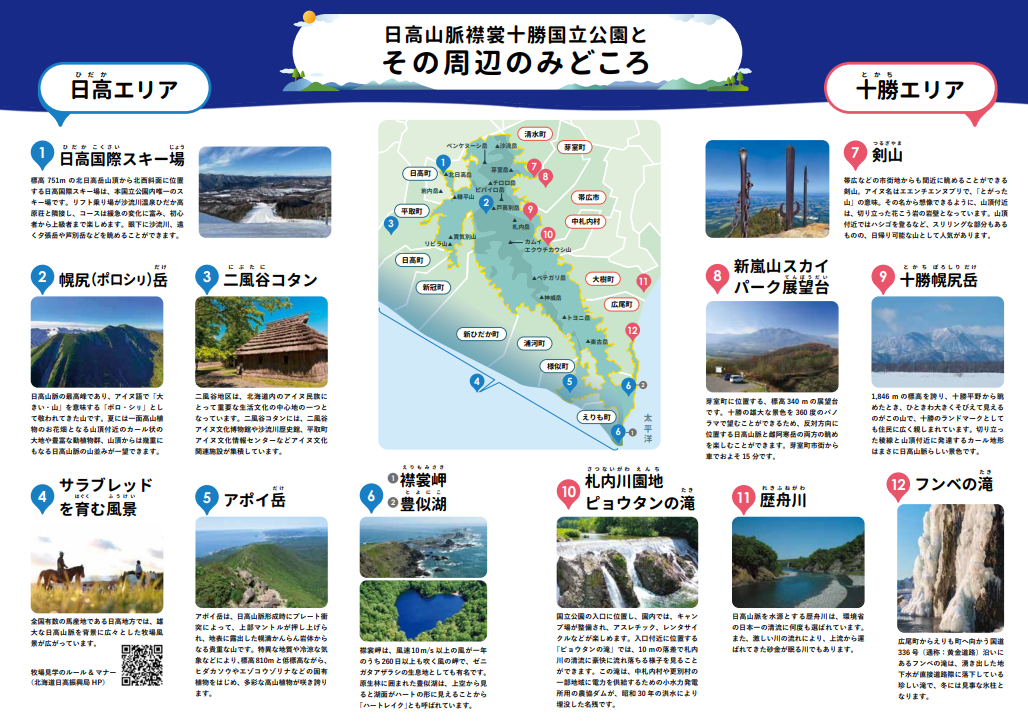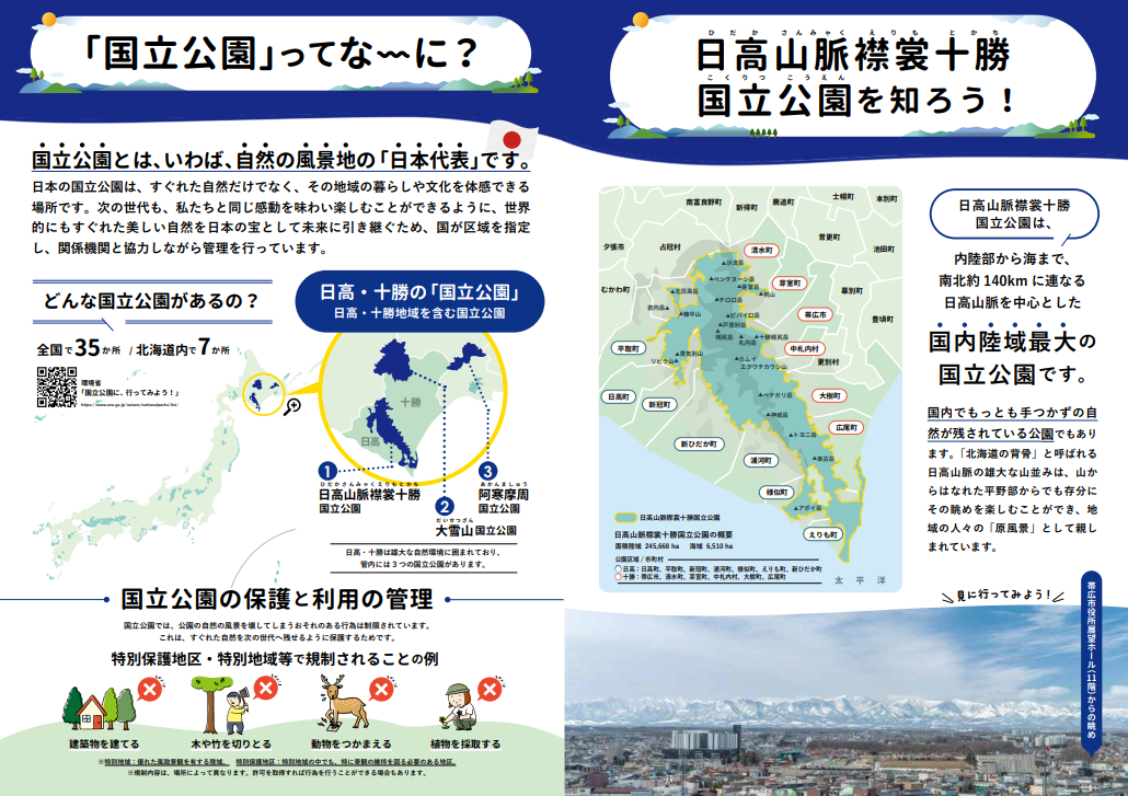十勝総合振興局、日高振興局及び日高山脈襟裳十勝国立公園・十勝環境保全委員会は、令和6年6月に指定された日高山脈襟裳十勝国立公園の理解促進を目的としたパンフレット「日高山脈襟裳十勝国立公園を知ろう」を作成しました!