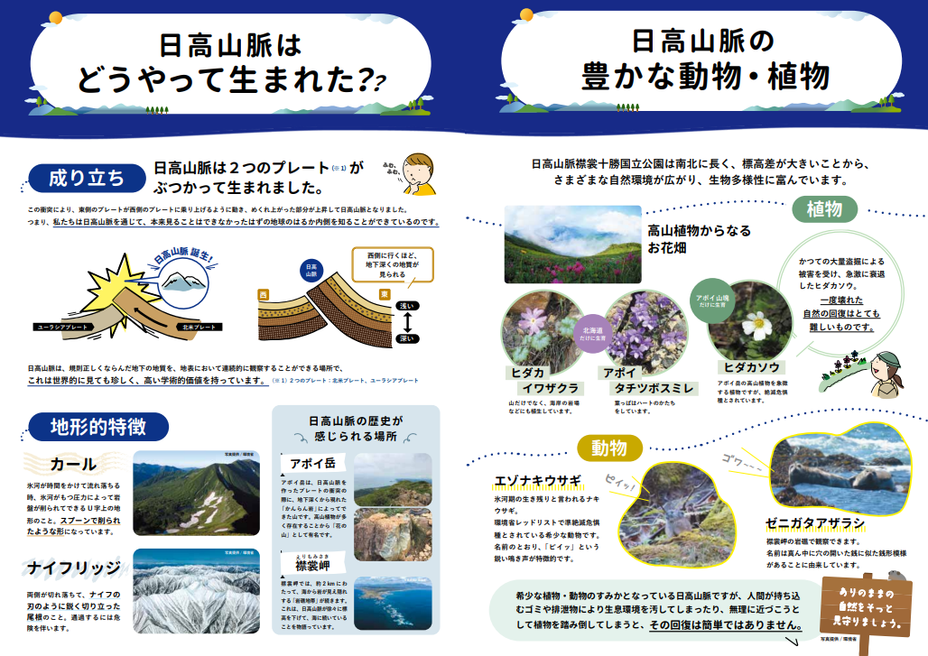 本パンフレットは、日高山脈の成り立ちや特徴的な自然環境、周辺のみどころなど、日高山脈襟裳十勝国立公園の魅力を掲載しています。