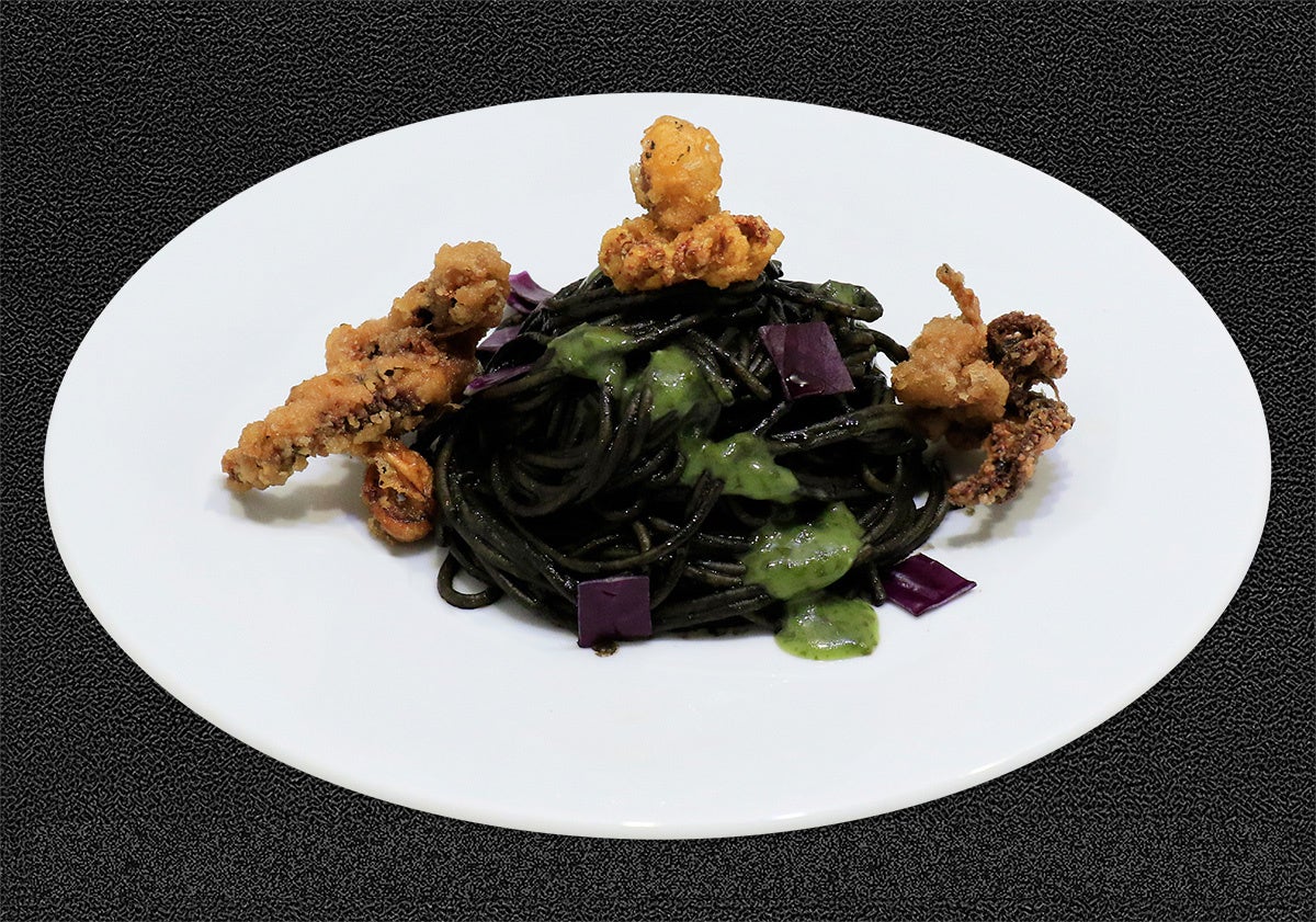邪神クトゥルフをイメージした真っ黒なフード。トマトソースベースのパスタに緑のバジルソースをかけ、イイダコ、イカゲソ唐揚げを添えました。
