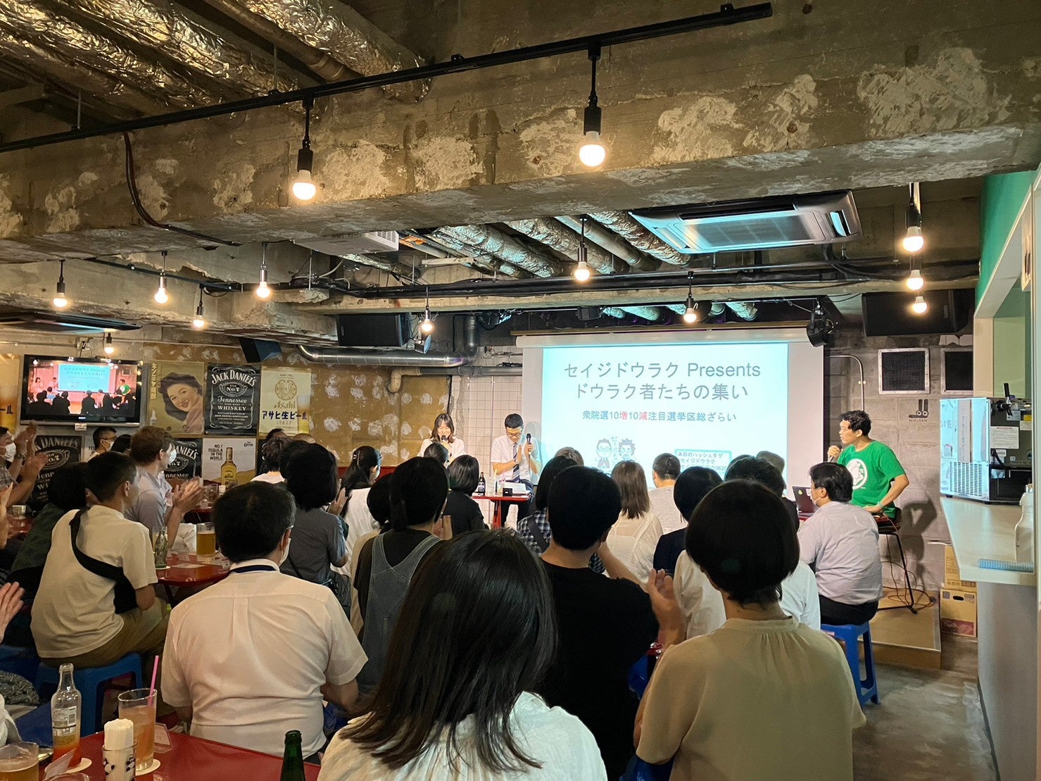 参加したのは番組パーソナリティのTBSラジオ澤田大樹記者と選挙ライターの宮原ジェフリー。会場には”ドウラク者”(=番組リスナーのこと)が集まり、笑いと熱気があふれる2時間となりました。