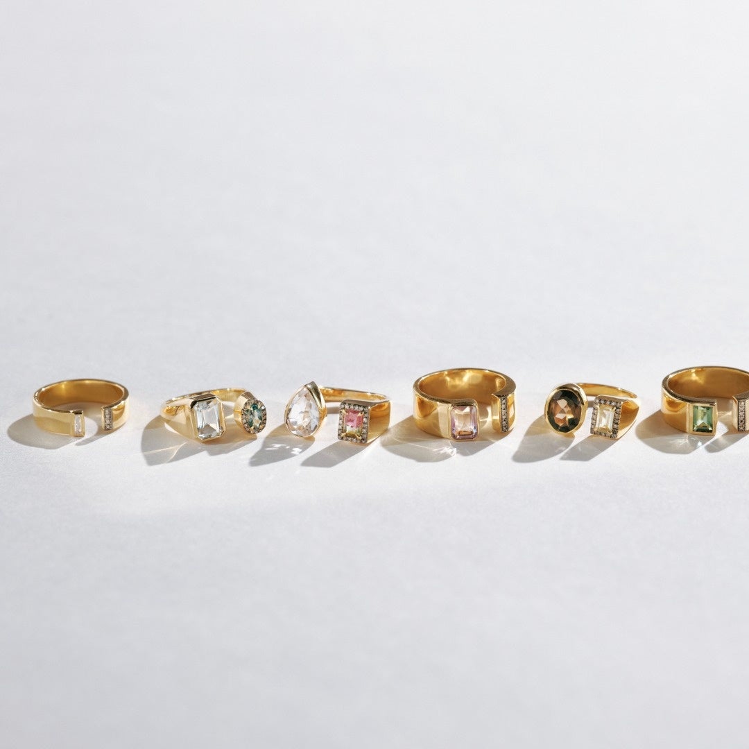 色鮮やかに煌めくカラーストーンを対照的に配し、パヴェダイヤモンドを添えた、モダニティ溢れるオープンリング。