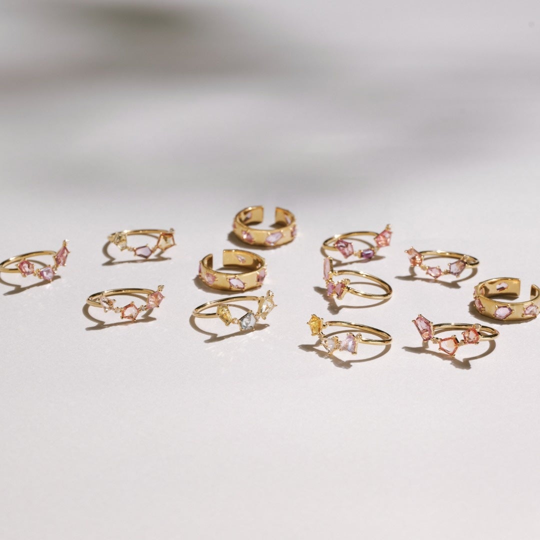 強い輝きと豊かな発色を放つ、マルチカラーのサファイアを指に添うように3石あしらったリング。色味やカットの異なるサファイアを6石ぐるり配したイヤーカフは、オープンリングとしても使える2WAY仕様です。どちらもひとつとして同じものはない1点ものとして発売いたします。