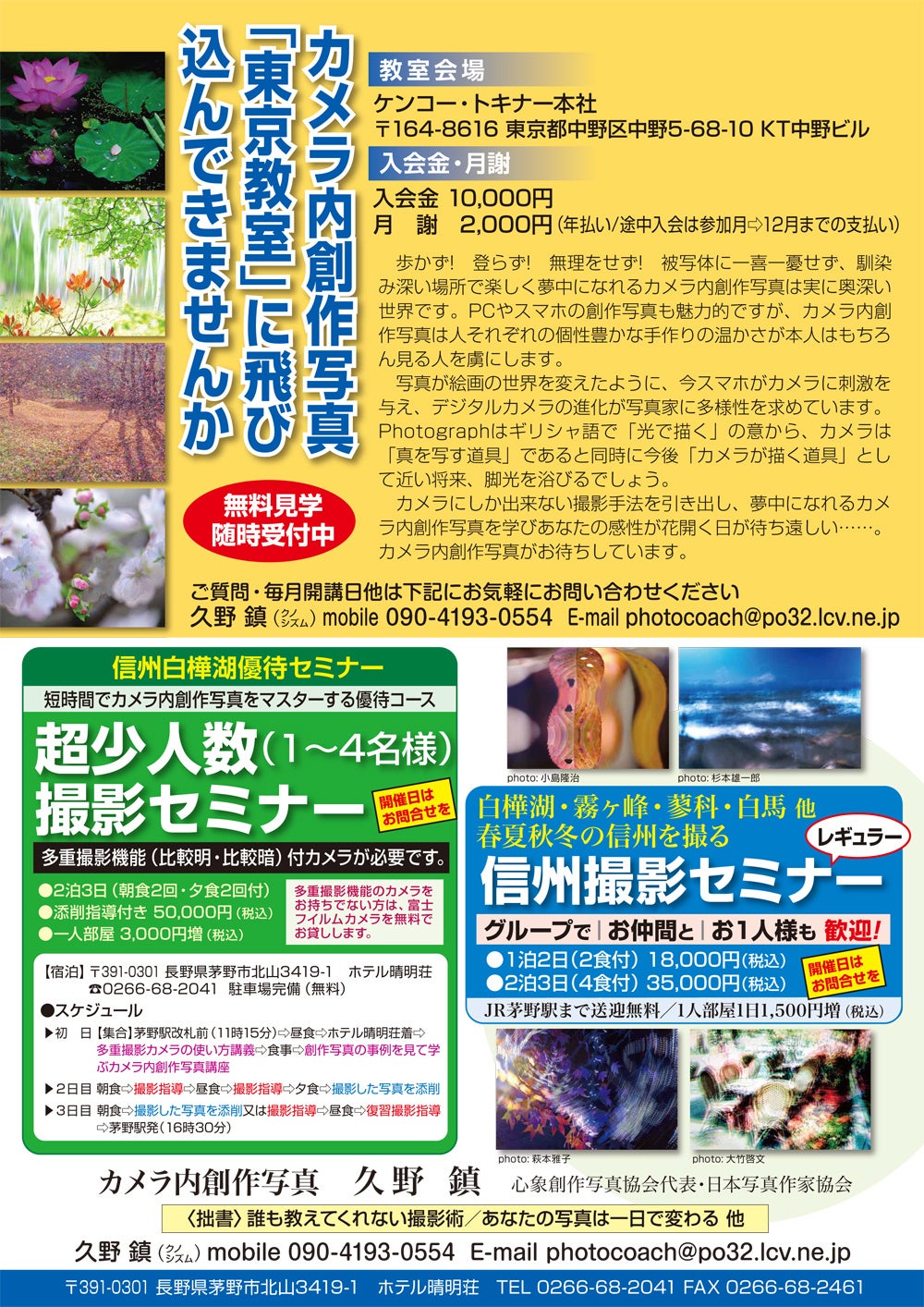 2008年~現在 白樺湖ホテル清明荘に常駐し白樺湖で毎月創作撮影セミナーを開催中。個性的な撮影手法の数々を編み出し多くのカメラ内創作写真愛好家を育成