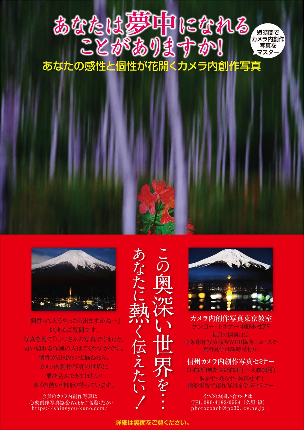 心象創作写真協会Web(https://shinsyou-kuno.com)ご高覧頂きを面白そう、楽しそうだと興味をもたれたら毎月行われている「無料見学」にいらっしゃいませんか。お待ちしています。