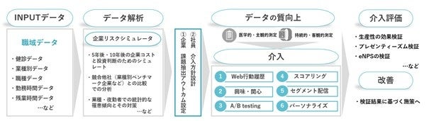 本アプリを社員に配布し、日々の業務の中で使用してもらうことで、社員のサポートを行うとともに、企業はアプリから得られる情報をもとに介入の評価や今後への改善策の検討が可能です。