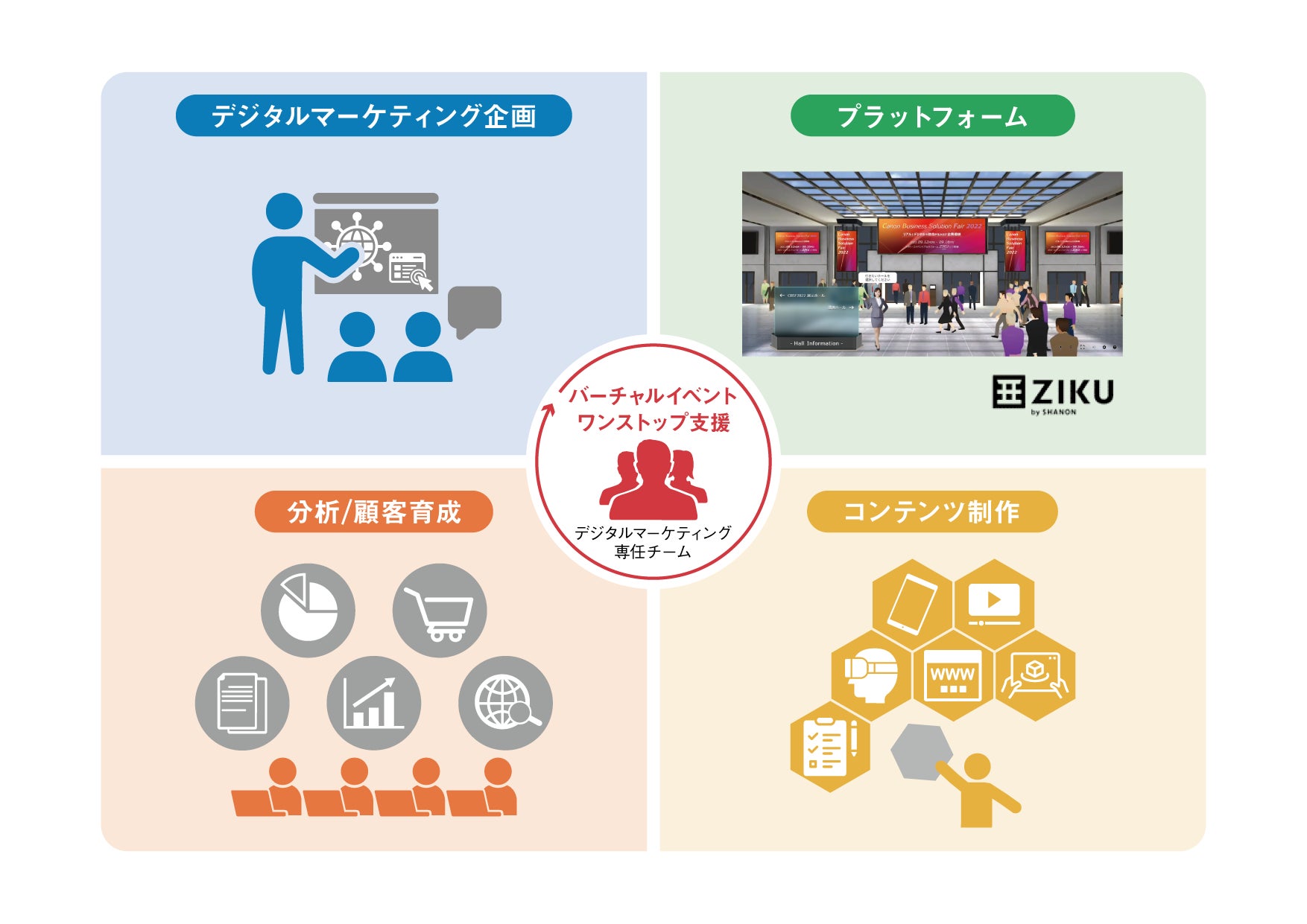 プラットフォームには株式会社ジクウの「ZIKU」を採用し、低コストかつ短期間で臨場感のあるイベントをバーチャル空間で実現できます。出展社はPCの環境に依存せず、ブラウザからイベントを制作することができ、また、来場者はスマートフォンからも簡単にアクセスが可能です。顧客属性や行動履歴から消費者行動の予測・シミュレーションを行うことで効果的なデジタルマーケティングを実現します。