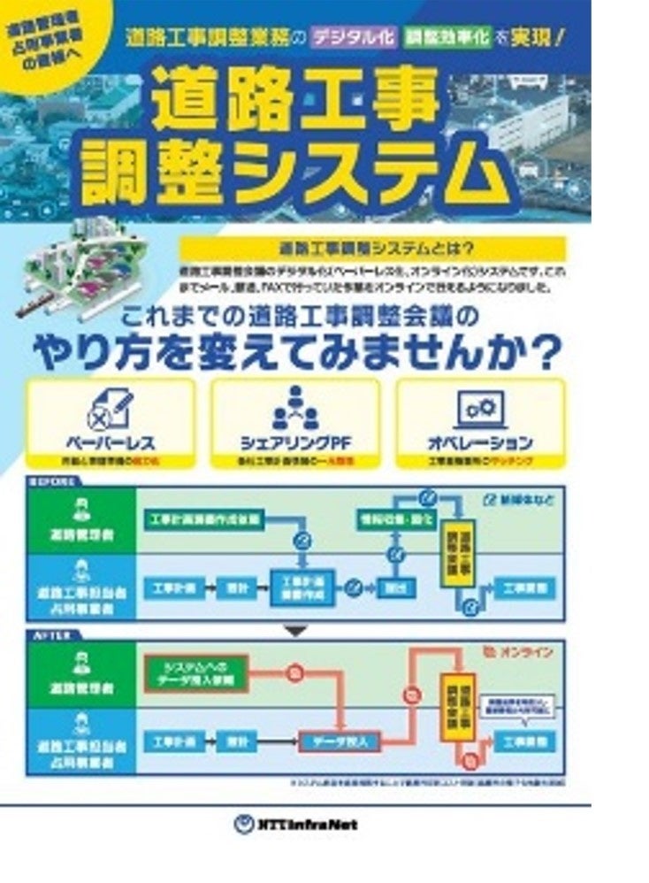 道路工事調整会議のデジタル化(ペーパーレス化、オンライン化)を実現するシステム。これまでメール、郵送、FAXで行っていた作業をオンライン上で実施可能とします。