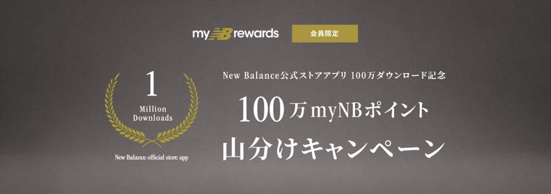 New Balance公式ストアアプリ、100万ダウンロード記念して、期間中にニューバランス公式オンラインストアにて、20,000円(税込)以上ご購入をされたmyNB会員様限定で、「100万myNBポイント」を山分けプレゼント。