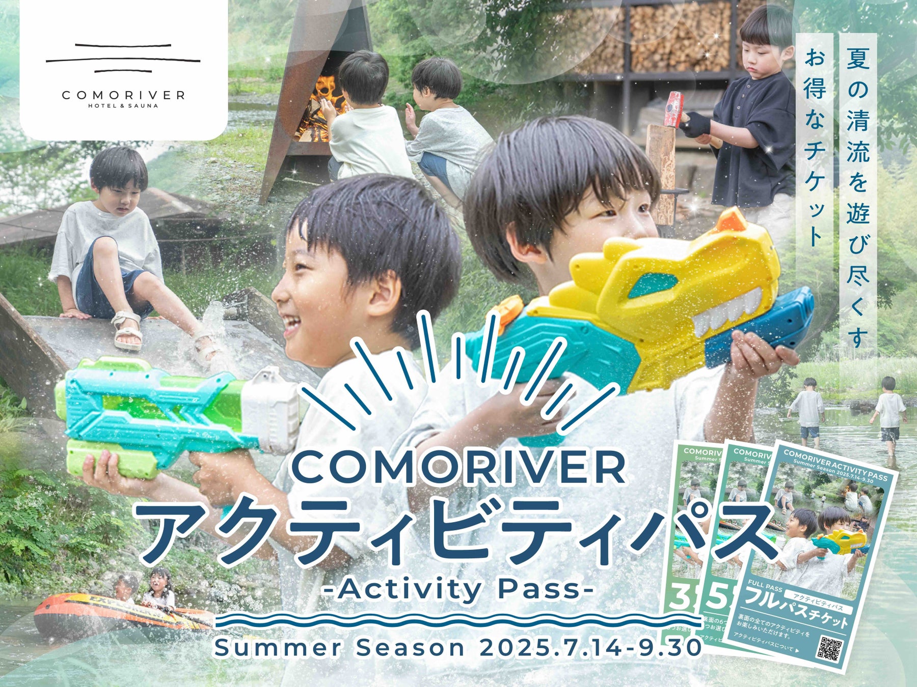 株式会社温泉道場(埼玉県比企郡ときがわ町、代表取締役 山崎寿樹)が運営する「COMORIVER」(埼玉県比企郡ときがわ町、以下 コモリバ)は、夏のアウトドア・川遊びコンテンツを複数セットで楽しむことができるお得な「アクティビティパス」を2025年7月16日から9月15日までの期間限定で販売いたします。