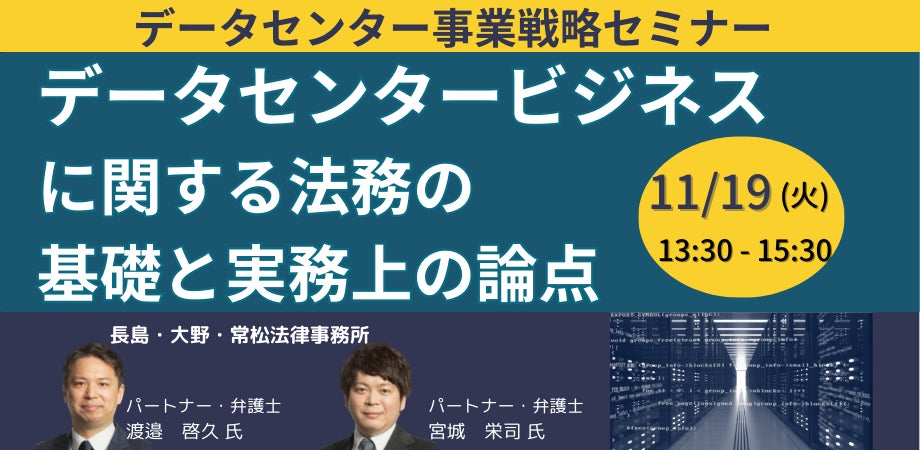 JPI(日本計画研究所)は、長島・大野・常松法律事務所 パートナー・弁護士 渡邉 啓久 氏、パートナー・弁護士 宮城 栄司 氏を招聘し、データセンタービジネスに関する法務の基礎と実務上の論点について詳説いただくセミナーを開催します。