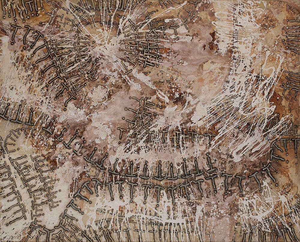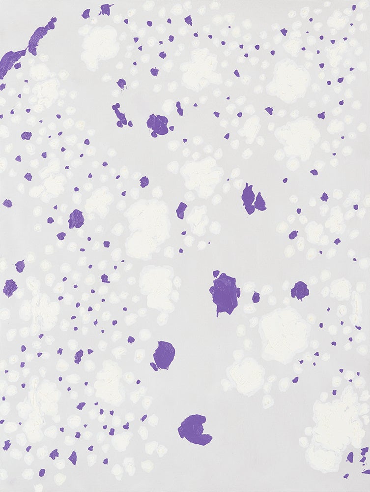 1970 年代以降、中西の絵画は理論的に洗練されていきました。その出発点の一つに位置づけられるのは〈弓形が触れて〉という連作で、タイトルが示唆するとおり、その画面上には竹弓が取り付けられています。作家いわく、それは画家と、画家が描くべき世界と、画家が向き合っている画面との位置関係を図示するための道具とのこと。いずれにせよ、彼は、画家が「どこで」「どこに」描くのかという問題にこだわり、さまざまに考えてきたとは言えるでしょう。もちろん、絵画の場所について問うなかで、「どんな」絵画が描かれるべきかも明らかにされなければなりません。ある決まった手順で描かれていく中西の絵画は、私たちの生きるこの世界の「発生と消滅」に関わっているようです。