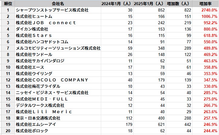 ・2024年1月時点と2025年1月時点の従業員数を比較