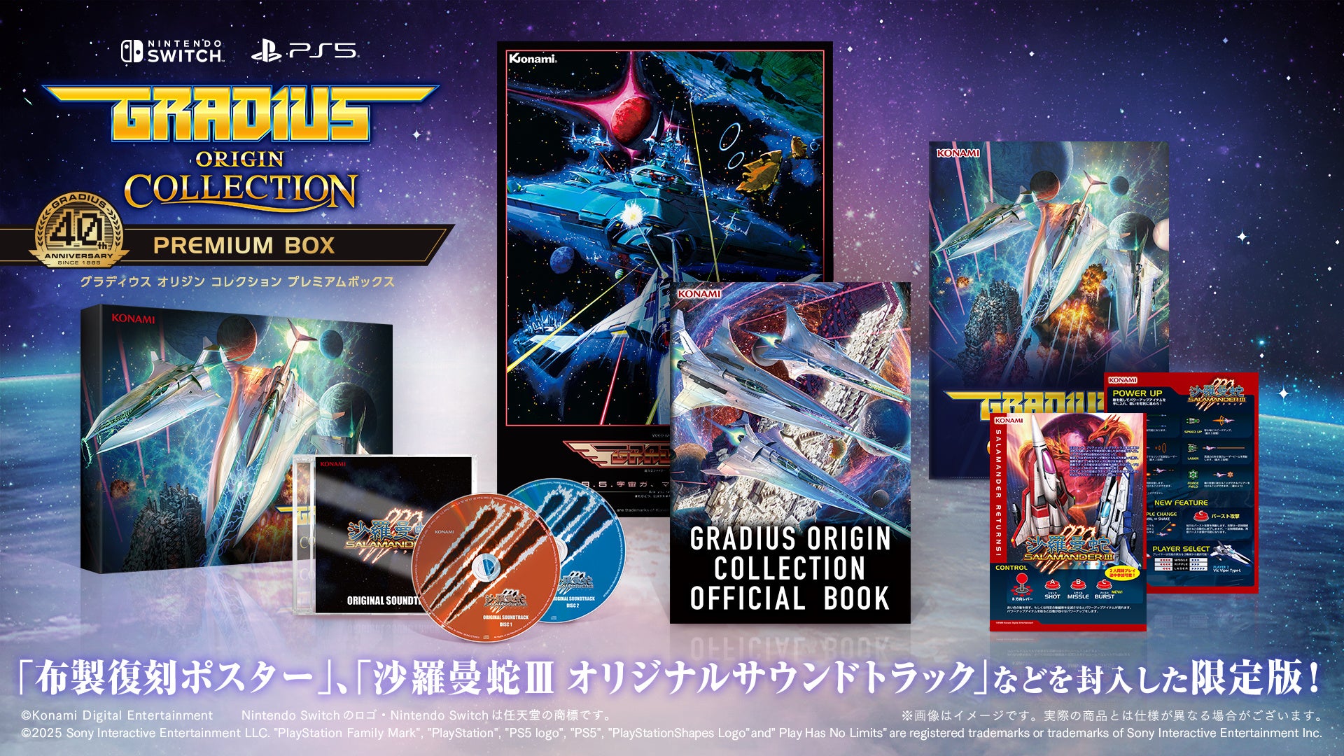 Nintendo Switch™版、PlayStation®5版はパッケージ通常版に加え、豪華化粧箱に入った限定版『グラディウス オリジン コレクション プレミアムボックス』も予約受付中です。グラディウスアーケード(1985)の復刻版布ポスターや、再デジタルスキャンされたアーケードポスターイラスト原画や当時を知るライター陣による熱いコラムを収録した冊子、『沙羅曼蛇Ⅲ』オリジナルサウンドトラックCDなど、1980年代当時から最新作までの「グラディウスオリジン」ワールドを存分に楽しめる商品内容となっています。ぜひご予約はお早めに!