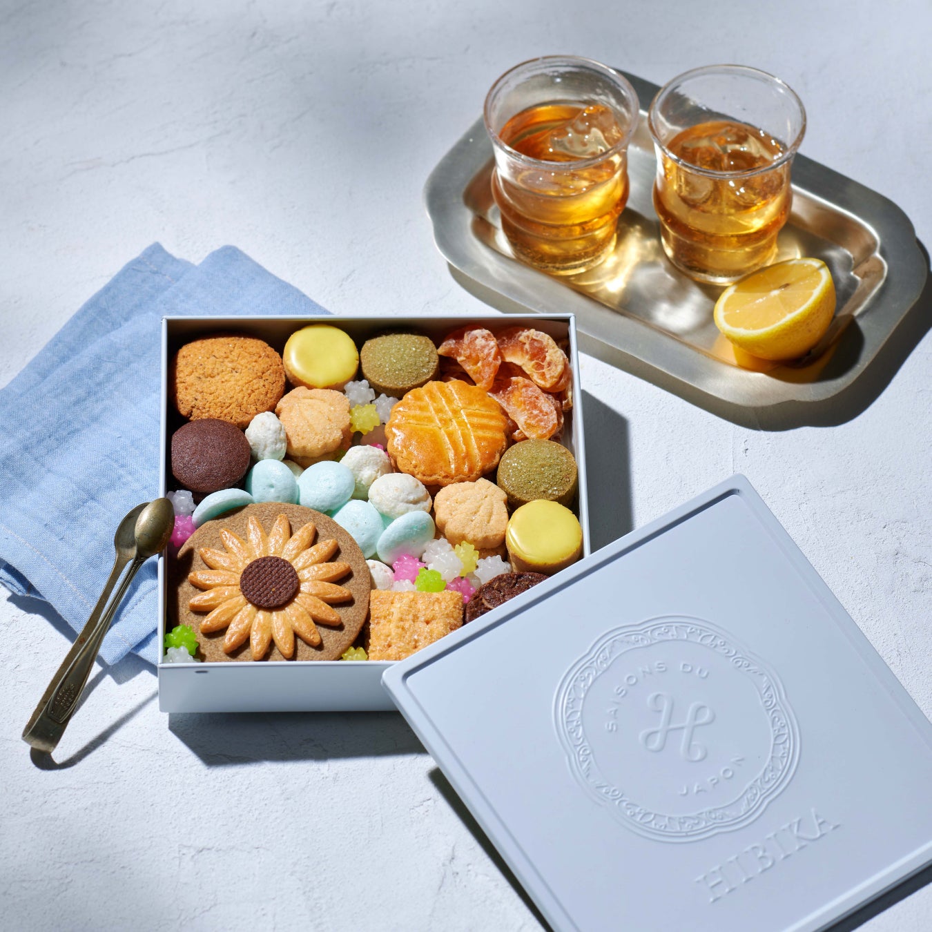 ひまわりをモチーフにした紅茶のクッキー、レモンのサブレ、ラムネのメレンゲ、爽やかな甘みのみかんのドライフルーツなど、色とりどりのお菓子を詰め合わせた夏のクッキー缶。