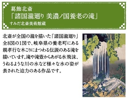 ●「諸国瀧廻り 美濃ノ国養老の滝(しょこくたきめぐり みののくにようろうのたき)」は、北斎が全国の瀧を描いた「諸国瀧廻り」全8図の1図で、岐阜県の養老町にある親孝行な木こりにまつわる伝説のある滝を描いています。滝や滝壺からあがる水飛沫、うねるような川の水など様々な水の姿が表されています。