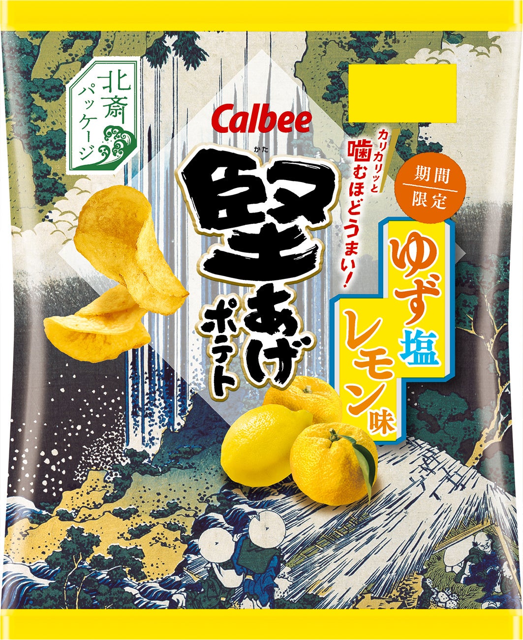 “堅あげポテトファン”との初代共創商品である夏の味が初めての葛飾北斎パッケージになって登場!『堅あげポテト ゆず塩レモン味』