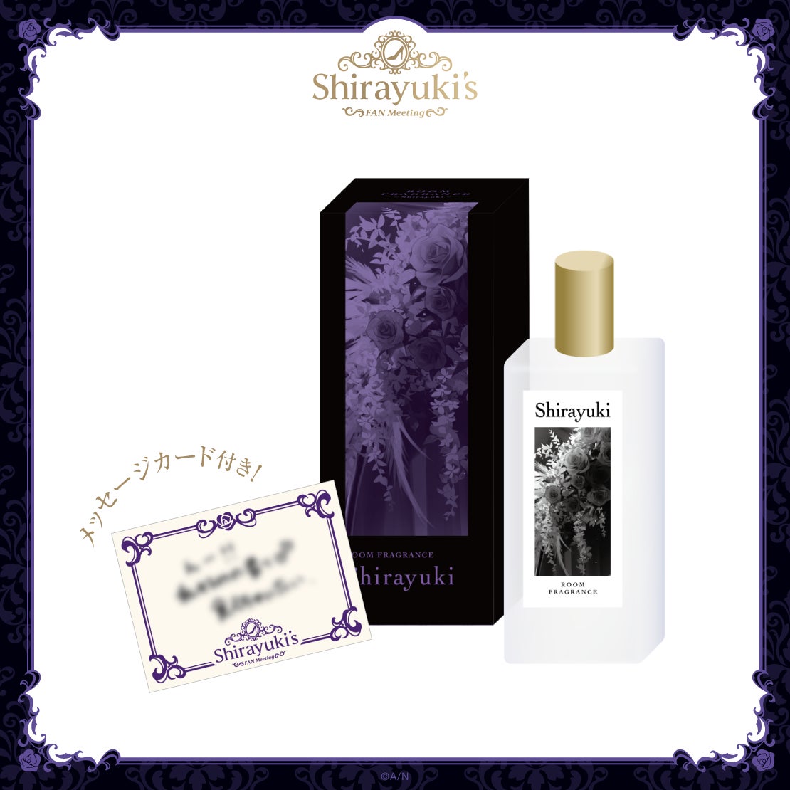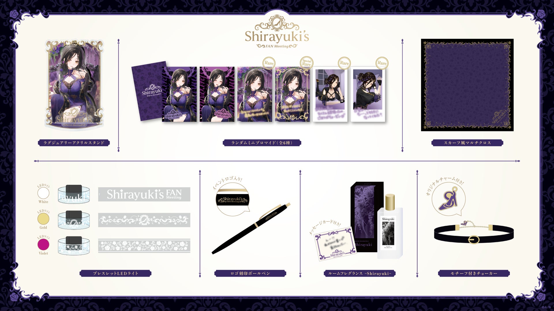 グッズラインナップは、ラグジュアリーアクリルスタンド、ランダムミニブロマイド、ブレスレットLEDライト、スカーフ風マルチクロス、ロゴ刻印ボールペン、ルームフレグランス -Shirayuki-、モチーフ付きチョーカーの全7種。