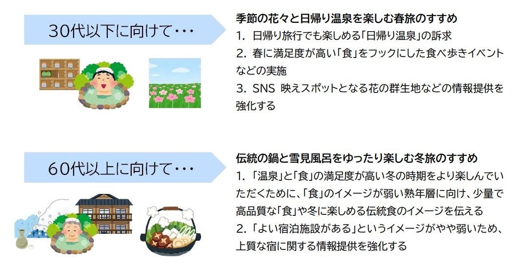 2. 年代別の誘致策としては、熟年層に対しては、「食」のイメージ、若年層に対しては、「四季折々の温泉」