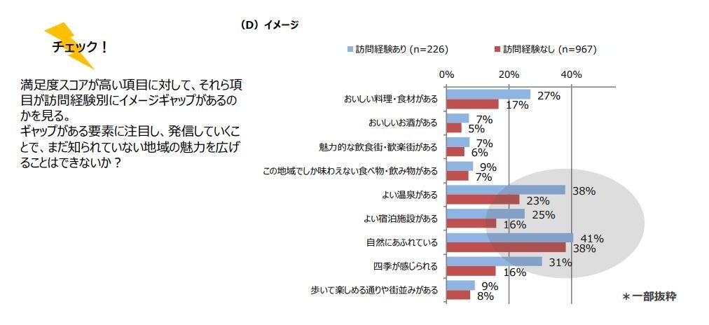 泉がある」「よい宿泊施設がある」については、どちらも訪問経験なしの人の方の割合が低く、訪問したこと