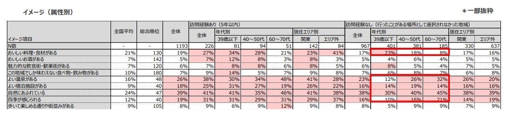 に関しては、特に39歳以下の若い層で弱いことがわかります。一方で、「おいしい料理・食材がある」という
