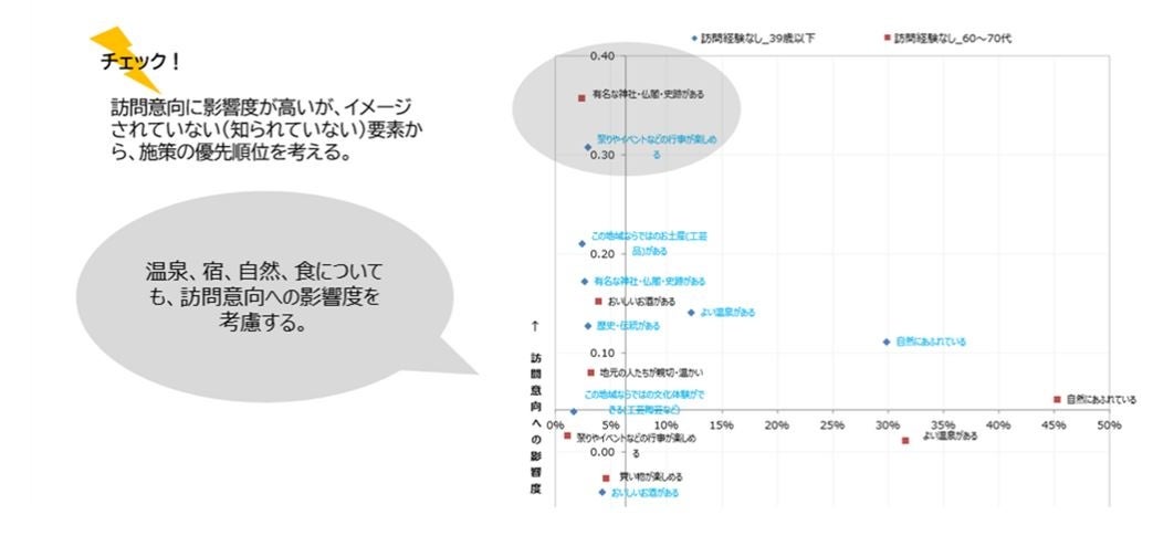 2. 60~70代では、「有名な神社・仏閣・史跡がある」ことは訪問意向を高めるために重要な項目ですが、その