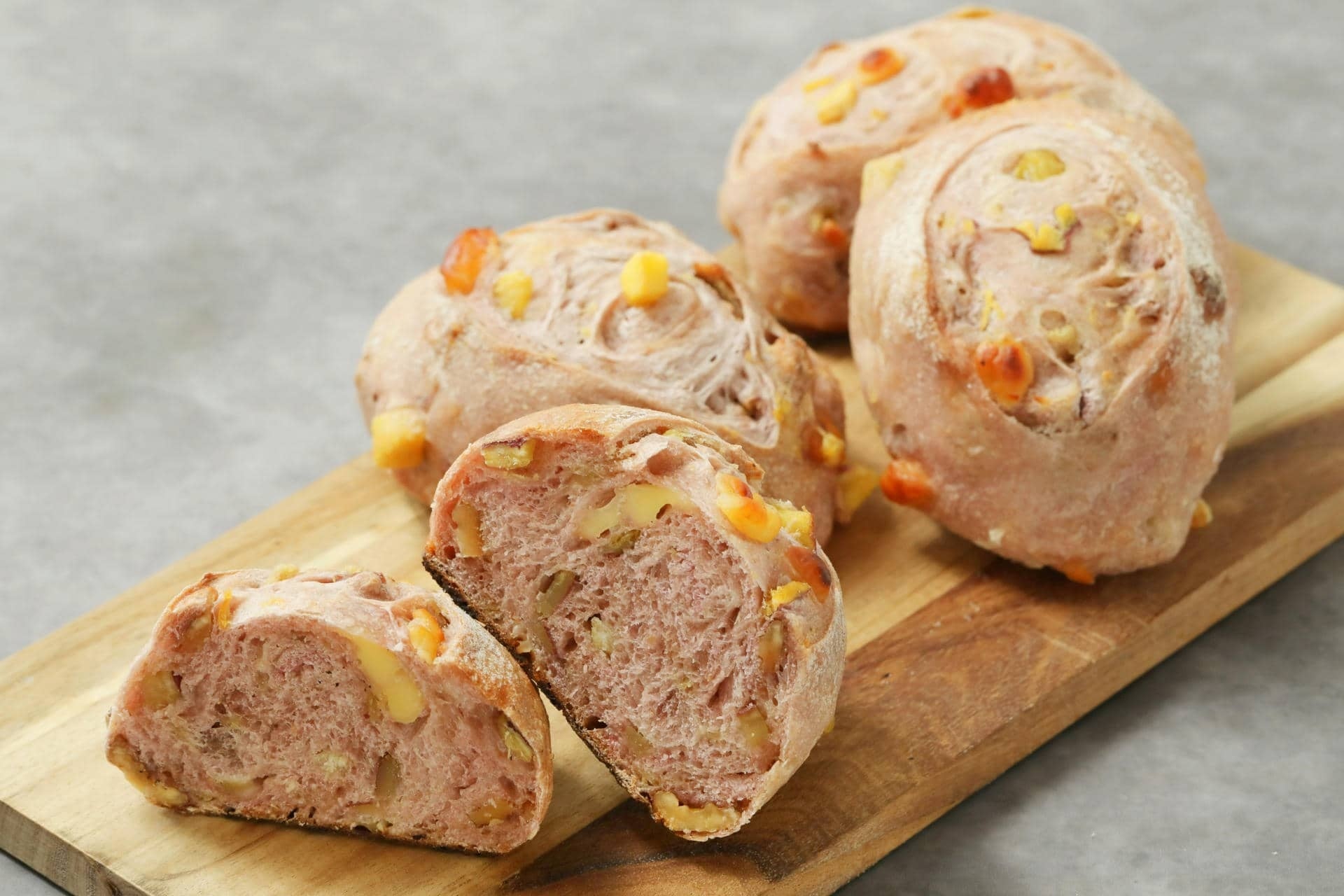 商品。紫芋パウダーを練りこんだライ麦生地に、金時芋