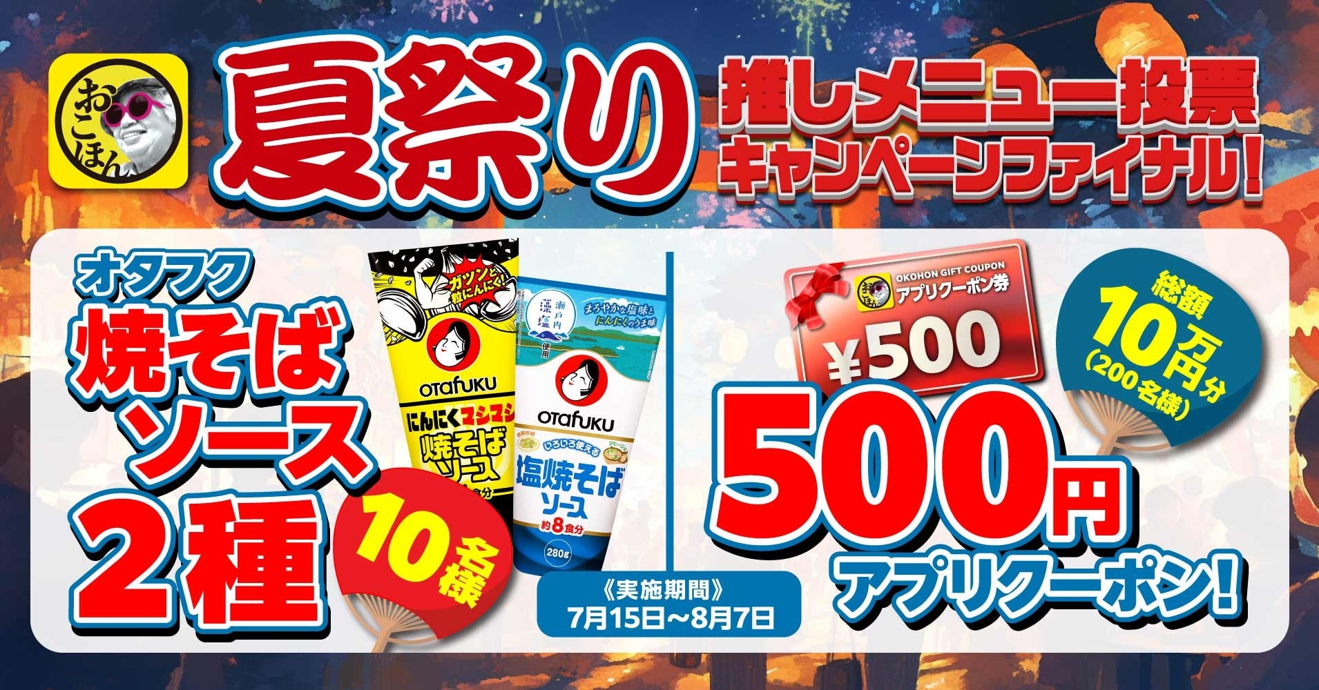 「おこほんの夏祭り」の4種類のメニューの中から、あなたのイチオシを「お好み焼本舗公式アプリ」よりご投票ください。ご投票いただいた方の中から抽選で「オタフク 焼そばソース2種」を10名様に、500円分のアプリクーポンを200名様に、プレゼントいたします。