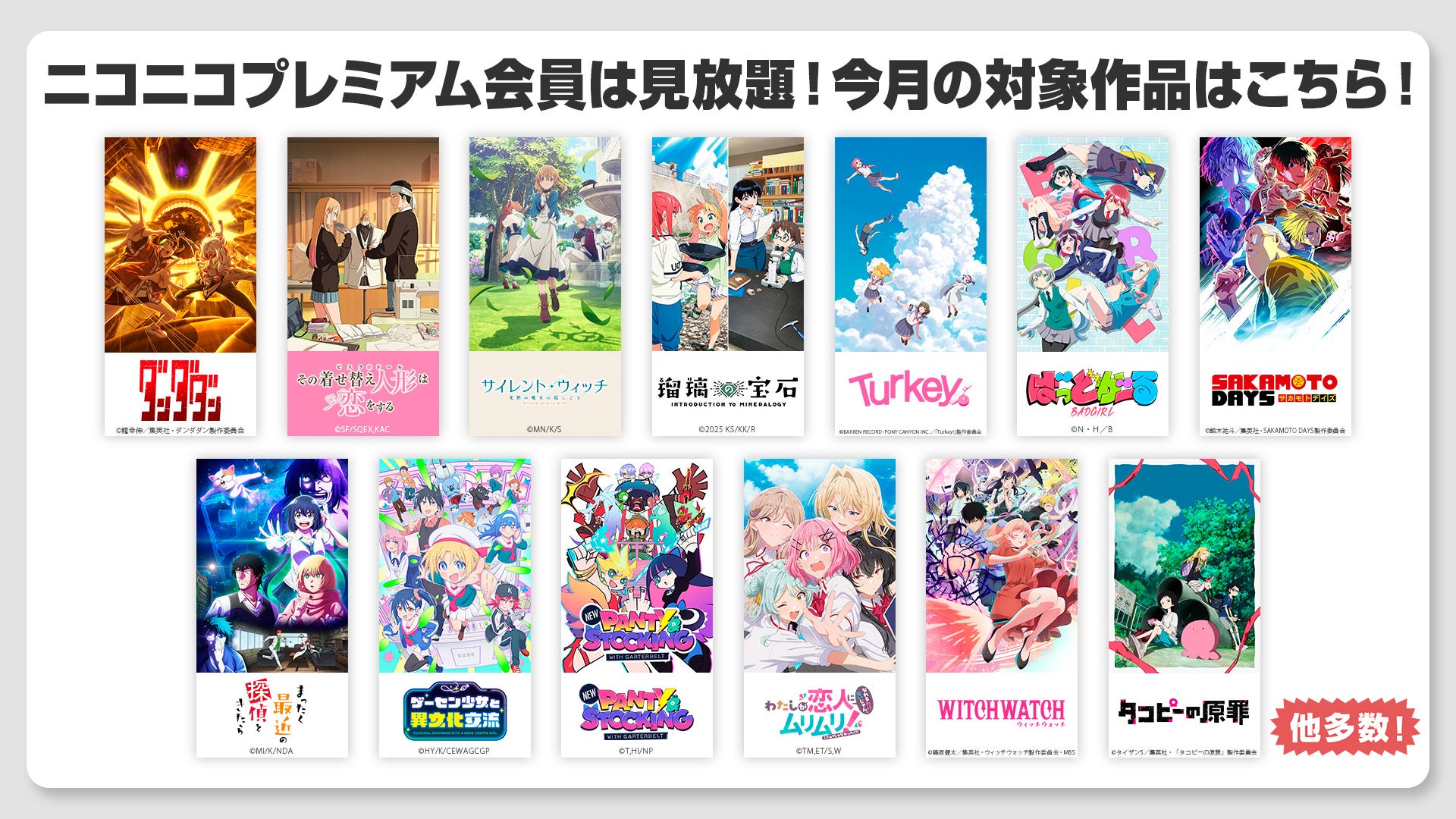 ニコニコでは、「ダンダダン」、「その着せ替え人形は恋をする」Season 2、「タコピーの原罪」など新作12作品を含めた、計27作品のニコニコプレミアム会員見放題を行います。