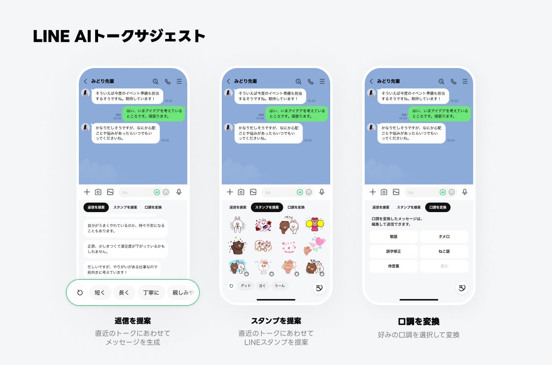 生成AIを活用した新サービスが「LINE」に誕生。「LINE AI」、「LINE AIトークサジェスト」を提供開始。「LINE」が人とAIをつなぐプラットフォームへ