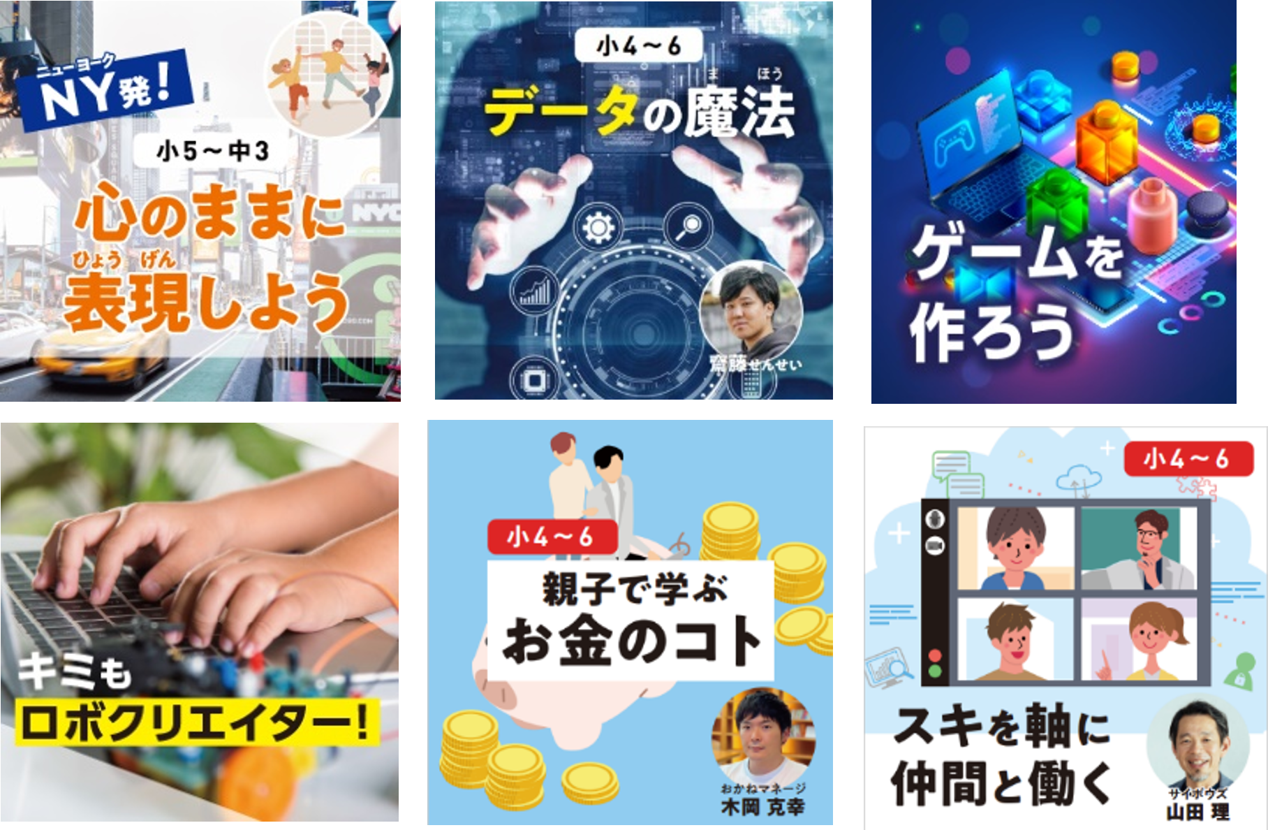 ●各講座8名程度の少人数形式。小中学生対象のオンラインライブレッスン(ZOOMを使用)。