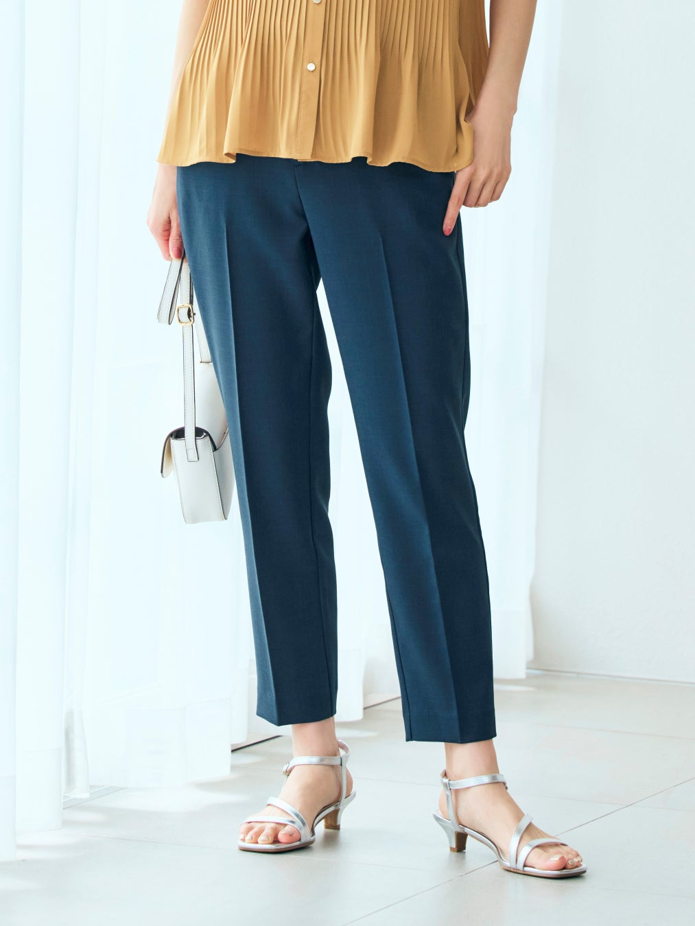 フロントはセンタープレスが入っており通勤シーンにもおすすめ。ウエストのバック部分はゴム仕様で着脱のしやすさもポイントです。清涼感のある素材で、暑い時季にもさらりと快適に着用していただけます。