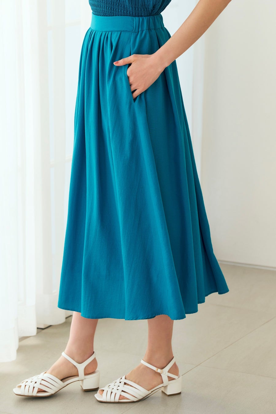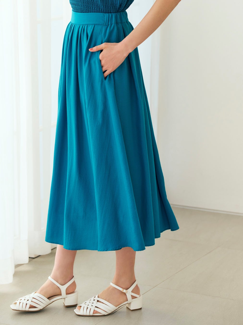 ウエストにギャザーをたっぷりと入れ、ボリュームをもたせたフレアスカート。ほどよく光沢感のある素材を使用し、涼しげな印象に仕上げました。
