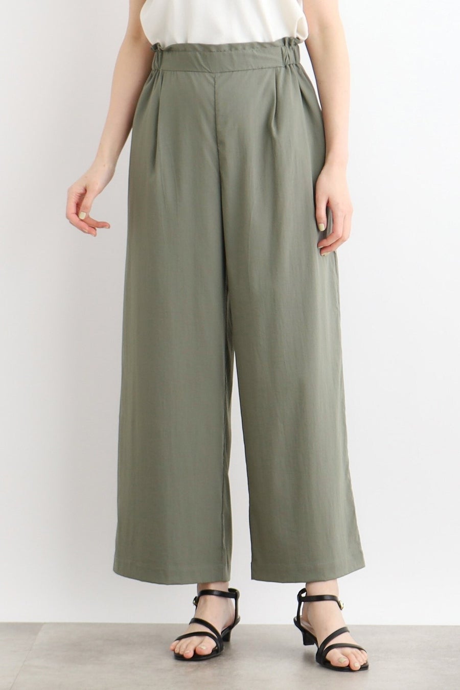 シンプルなデザインなので、幅広いスタイリングに合わせやすくデイリーに活躍する一枚です。ウエストはゴム仕様でリラックス感のあるはき心地ながら、ストンとした落ち感のある素材とすっきりとしたワイドシルエットが綺麗なラインを実現してくれます。