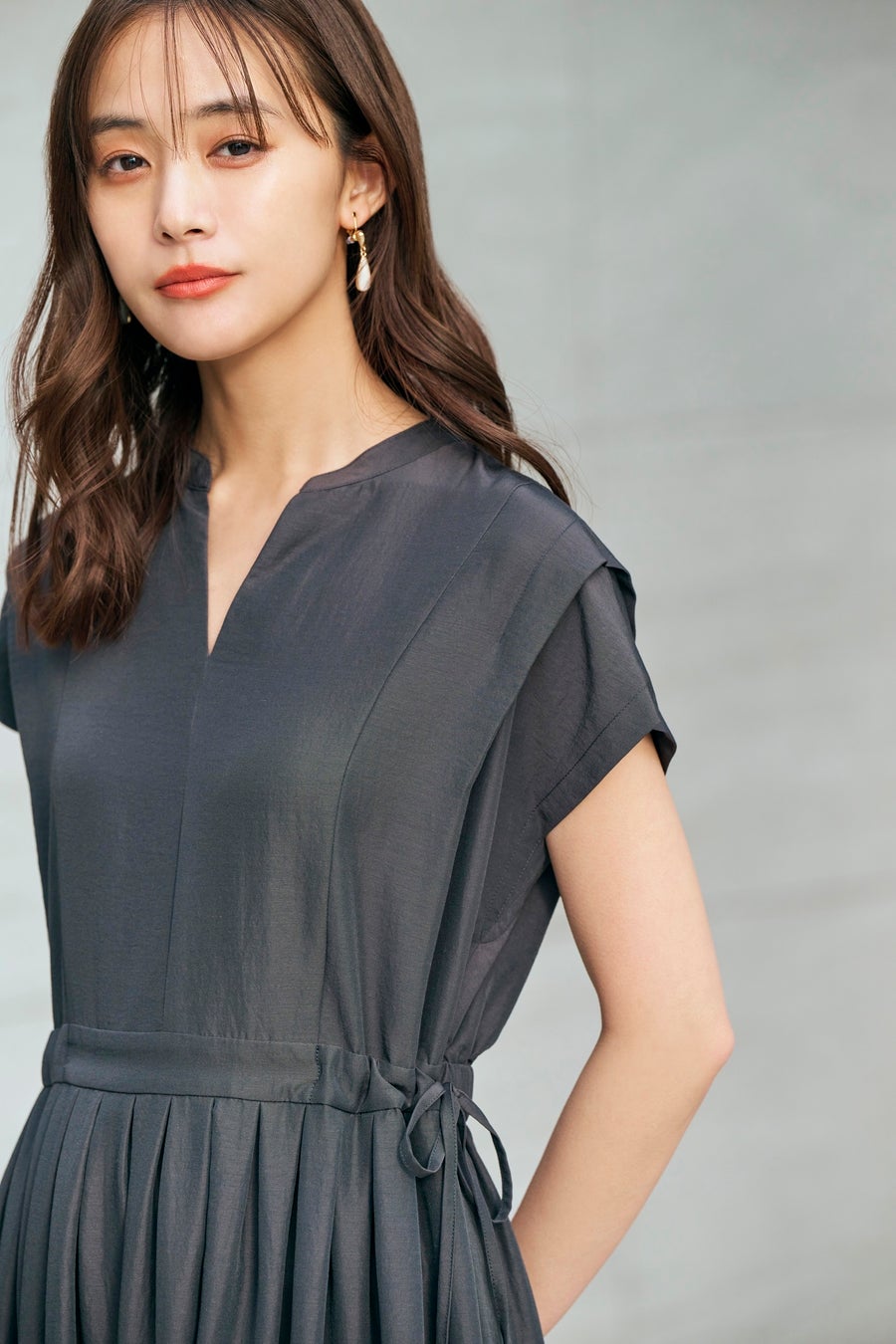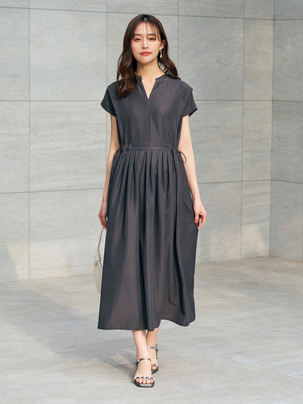 やや高めのウエスト位置でシェイプさせ、ベルトの下部分にたっぷりとタックを入れることで生まれる美しいフィット&フレアのシルエット。スタイルアップして見えるのと同時に歩いた時の揺れ感が優雅な印象に。袖がフレンチスリーブですっきりとしたデザインなので、カーディガンやジャケットも羽織りやすいのも魅力です。