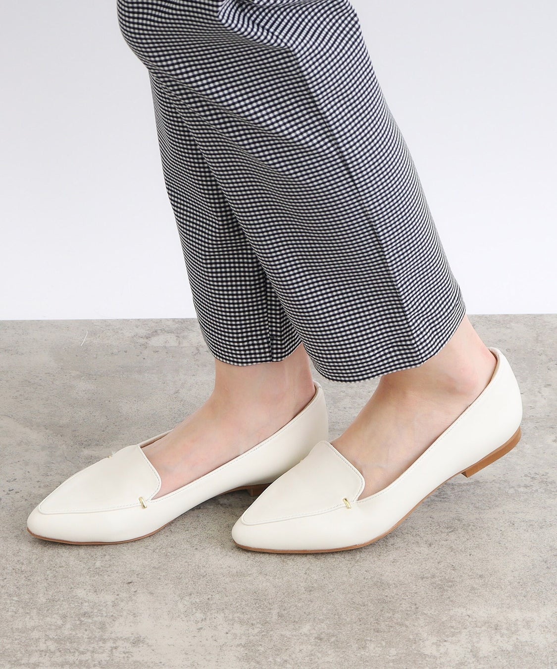 すっきりとしたアッパーデザインにメタルパーツが光るシャープな印象のローファーパンプス。フラットヒールながらポイテッドトウなので、オフィスシーンにもお使いいただけます。