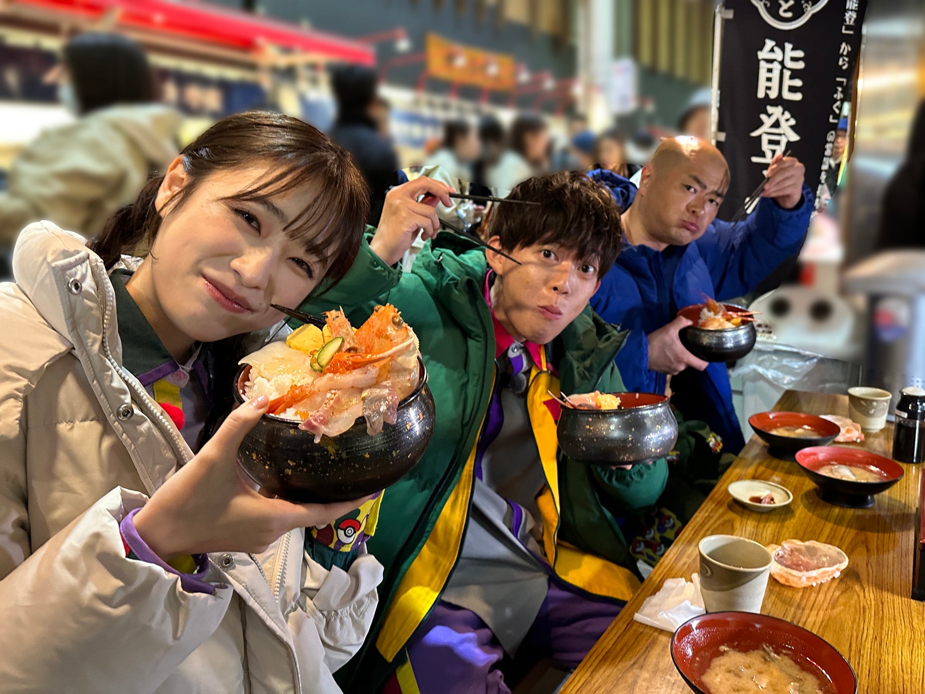 さらに、近江町市場で腹ごしらえをした一同は、センスばつぐんなポケだち姉妹と一緒に、ぬいぐるみと一緒に映える写真を撮る“ぬい撮り”対決!! 『ポケットモンスター スカーレット・バイオレット ゼロの秘宝』「前編・碧の仮面」に登場するイイネイヌ・マシマシラ・キチキギスの3匹と一緒に映える写真を撮るよ!