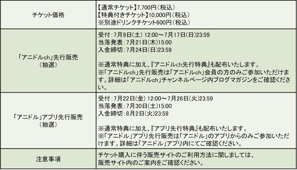 本イベントのチケットは「アニドルch」会員限定で7月9日(土)より先行抽選販売いたします。 この機会に「アニドルchプレゼンツ A-LIVE」に足をお運びいただき、この日だけのスペシャルなLIVEイベントをお楽しみください。