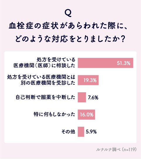 血栓症が疑われる症状があらわれた際の対応について聞いてみると、「処方を受けている医療機関(医師)に相談した」51.3%、「処方を受けている医療機関とは、別の医療機関を受診した」19.3%となり、医療機関を受診したのが7割以上となる一方で、「特に何もしなかった」16.0%、「自己判断で服薬を中断した」7.6%、「その他」5.9%となり、医療機関を受診しなかった人が約3割いることも分かりました。
