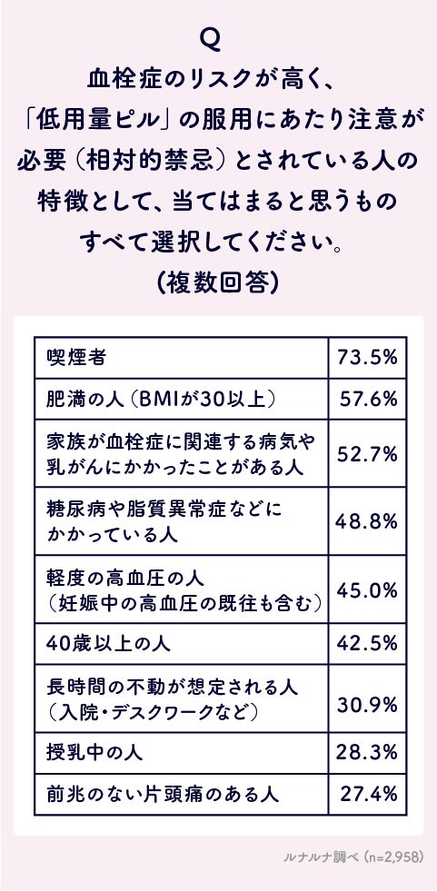 Q. 血栓症のリスクが高く、「低用量ピル」の服薬が禁止(絶対禁忌)とされている人の特徴として、当てはまると思うものすべて選択してください。(複数回答)