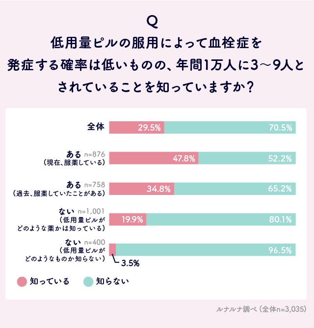 さらに、低用量ピルの服用によって血栓症を発症する確率については、「知っている」29.5%、「知らない」70.5%となり、具体的な発症確率まで知っている人は約3割にとどまることが分かりました。