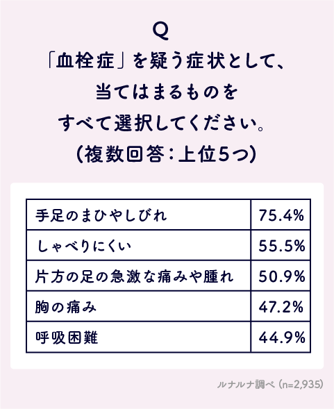 Q. 「血栓症」は突然発症するため、早期発見および迅速な医療機関への受診が大切です。「血栓症」を疑う症状として、当てはまるものをすべて選択してください。(複数回答)