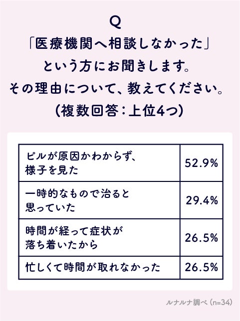医療機関を受診しなかった人にその理由を聞いてみたところ、回答が多い順に、「ピルが原因かわからず、様子を見た」52.9%、「一時的なもので治ると思っていた」29.4%、「時間が経って症状が落ち着いたから」26.5%、「忙しくて時間が取れなかった」26.5%となるなど、緊急性のある症状だとは思っていなかったことがうかがえます。