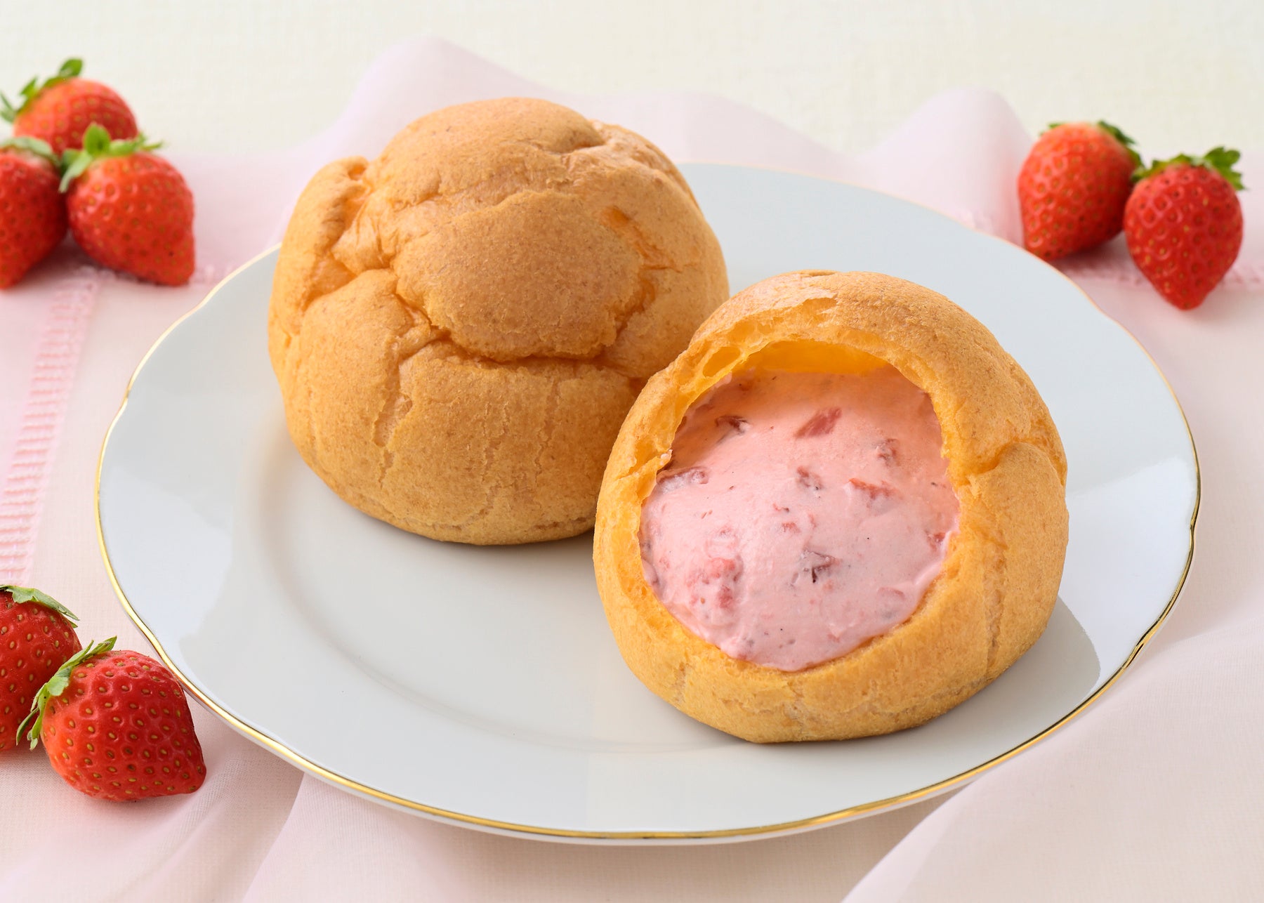 苺の果肉をたっぷり加えたホイップクリームを、歯切れと口どけのいい、風味豊かなシュー皮に、たっぷりと詰め込みました。