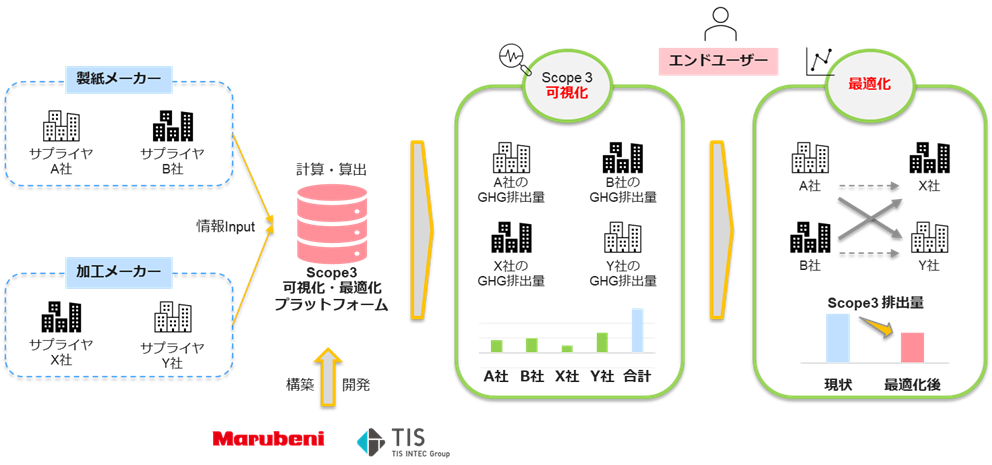 TISインテックグループのTIS株式会社(本社:東京都新宿区、代表取締役社長:岡本 安史、以下:TIS)は、丸紅株式会社(以下:丸紅)の段ボール調達に伴う温室効果ガス(以下:GHG)排出量の可視化と、環境負荷を考慮したサプライチェーンの最適化を実現するScope3※1可視化・最適化プラットフォーム構築を支援したことを発表します。