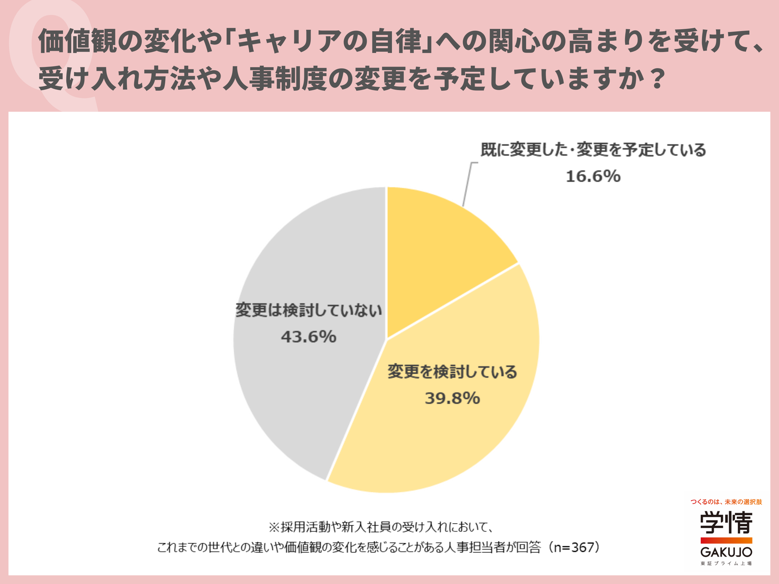 価値観の変化や「キャリアの自律」への関心の高まりを受けて、新入社員の受け入れ方法や人事制度を「変更した・変更を予定している」と回答した企業が16.6%となりました。6社に1社は、「キャリアの自律」への関心の高まりを受け、受け入れ方法や人事制度を変更している、または変更を予定していることが分かります。また39.8%の企業が「変更を検討している」としました。